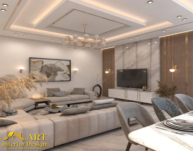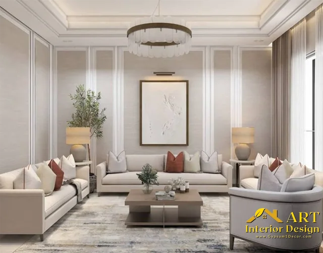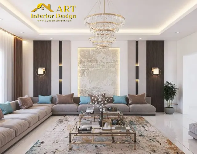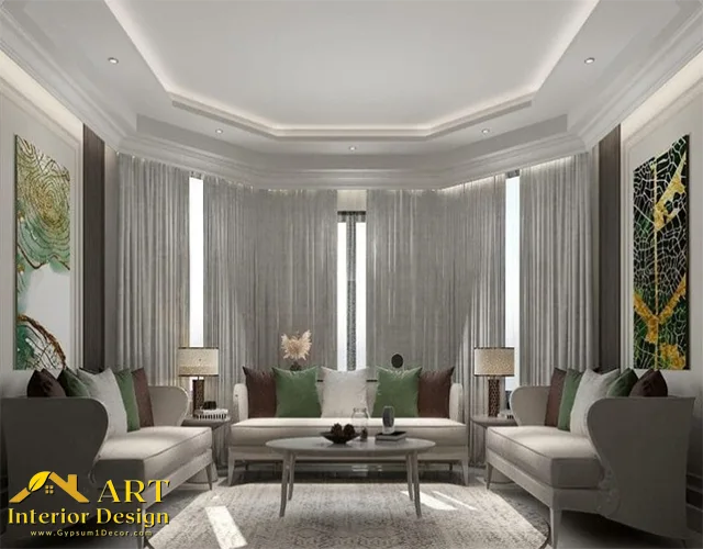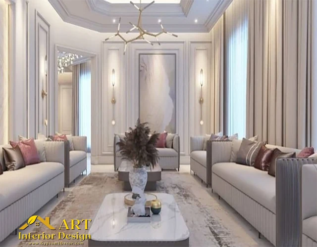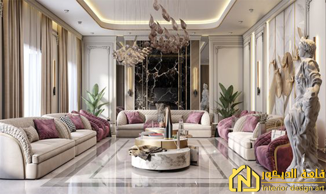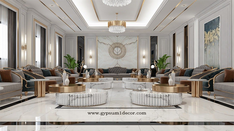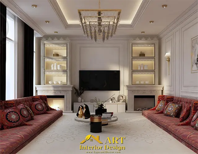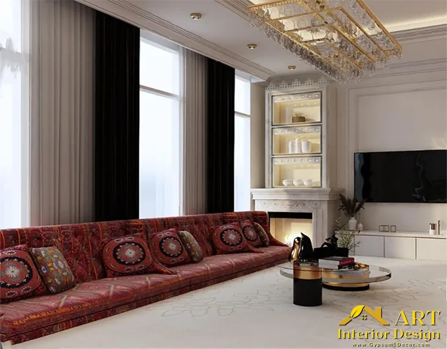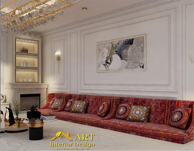 الديكور والمفروشات: يجب الانتباه إلى التفاصيل الصغيرة في تصميم المجالس العربية، مثل الأسقف المزخرفة والجبسون بورد المودرن والسجاد العريض والمخدات المزينة بالزهور والزخارف العربية الفخمة.