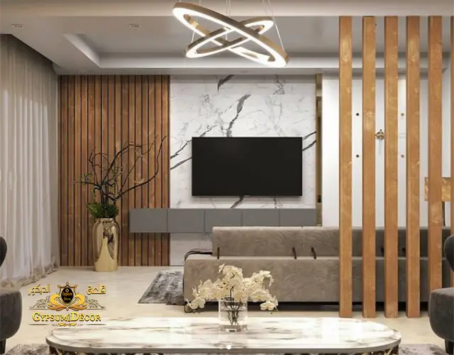 مع عمل ديكورات مختلفة لشكل العامودين، سواء من الطوب الهاشمي او من ورق الحائط، وفي المنتصف اي شكل من اشكال طاولات الخشب وممكن تنفيذها ايضا جبس بورد، كما يقوم مهندسين الديكور بعمل جبس البارز لشاشات التليفزيون.