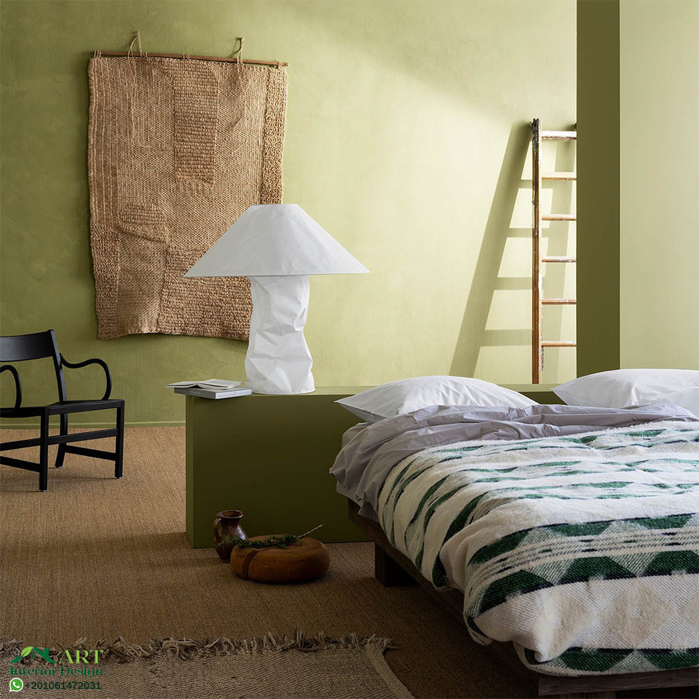 تناسق مميز في ألوان دهانات غرفة النوم ، حيث اعتمدت على لون مثل الكاكاو لطلاء الجدار الرئيسي خلف السرير ، بينما تم استخدام اللون البيج للجدران الأخرى.