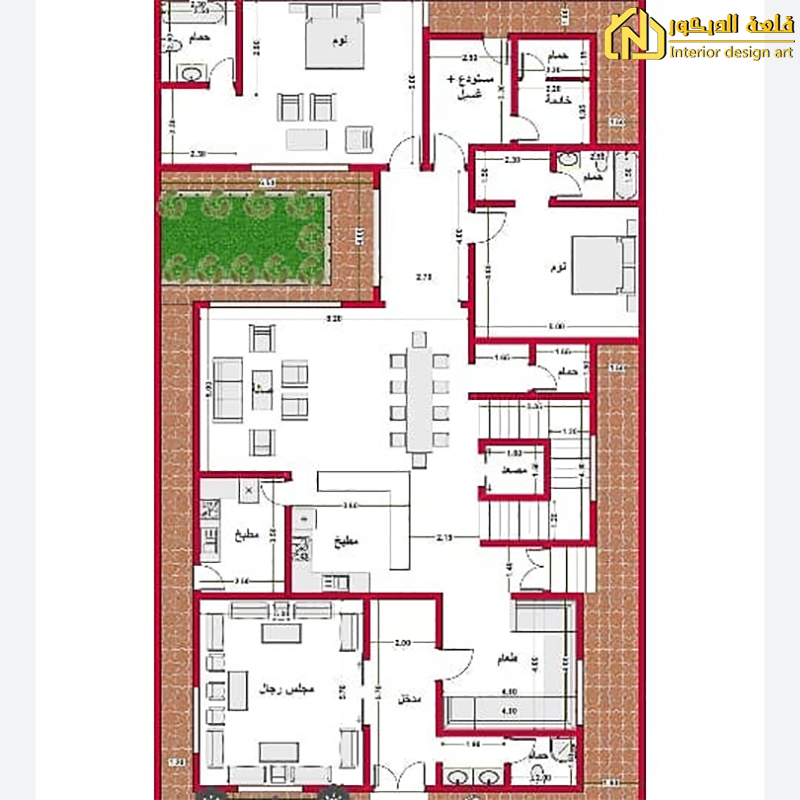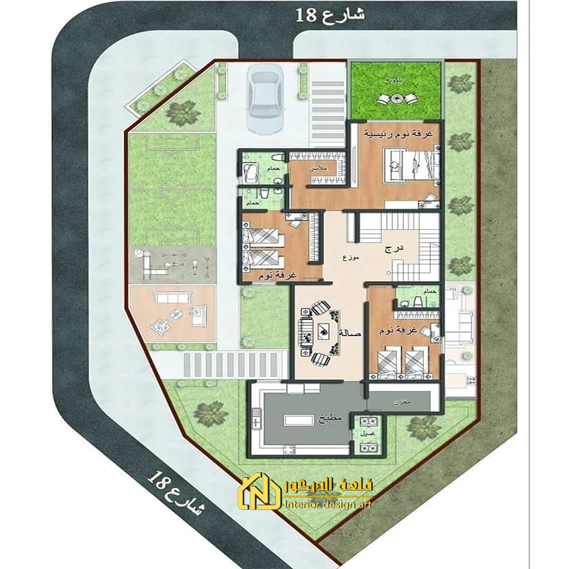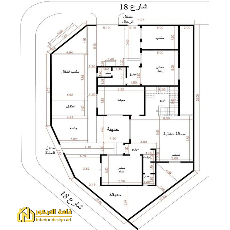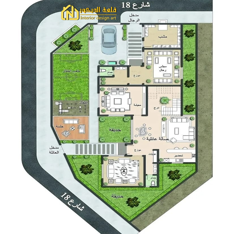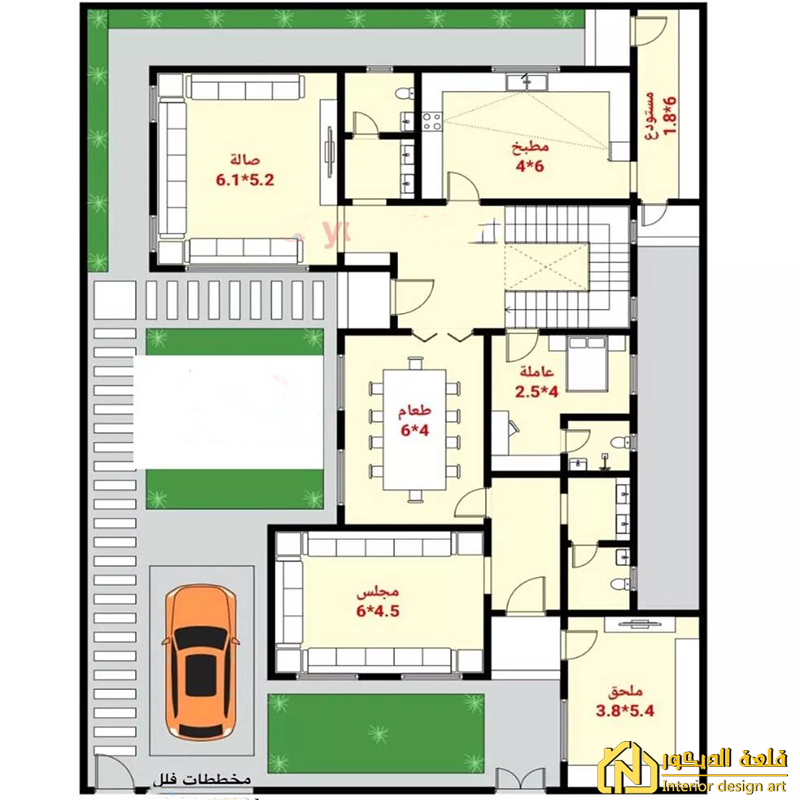 هنا يوجد مخطط فلل دورين درج داخلي، هو عبارة عن تصميم للطابق الأول بالكامل مخصص لاستقبال الضيوف والأصدقاء، حيث يحتوي على مدخل رئيسي للفيلا وبهو واسع امام الباب ويوجد في اخر التصميم غرفة مجالس رجال فخمه.