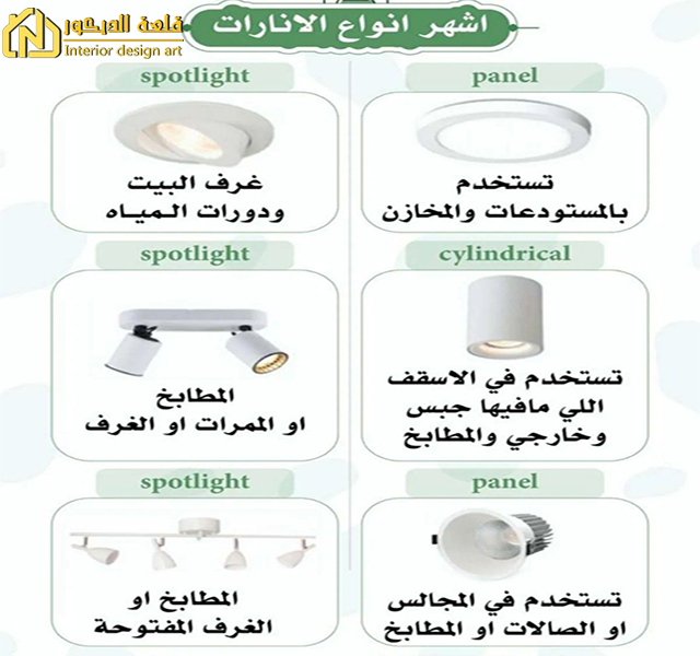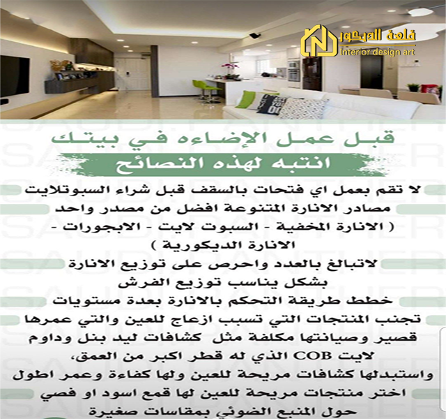 الإضاءة: يمكن استخدام الإضاءة المخفية لإضفاء مظهر عصري على شقتك، يمكن استخدام الإضاءة المناسبة لتسليط الضوء على الجدران والأرفف، أو استخدام الإضاءة الكاشفة المخفية لإضفاء الإضاءة المباشرة على المناطق المختلفة في الشقة.