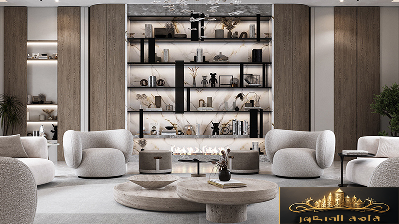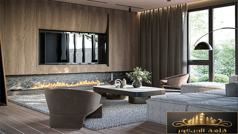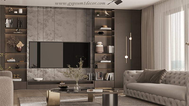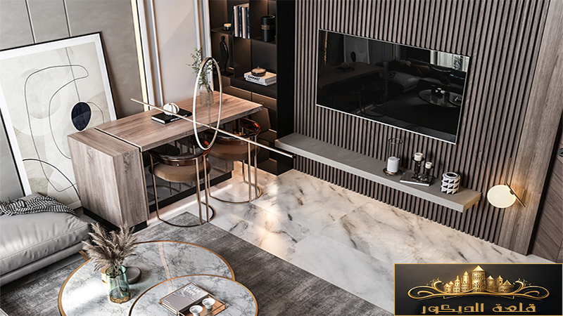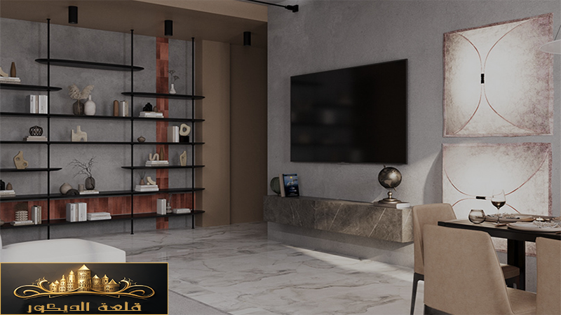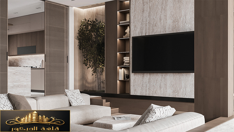 استخدام الرفوف الخشبية المثبتة على الحائط بجوار التلفزيون لعرض الديكورات الصغيرة واللوحات الفنية، مما يضفي بعدًا جماليًا على الديكور، مع وضع خلفية خشبية بسيطة وجميلة خلف وحدة التلفزيون لإضفاء لمسة من الجمالية والدفء على الديكور.