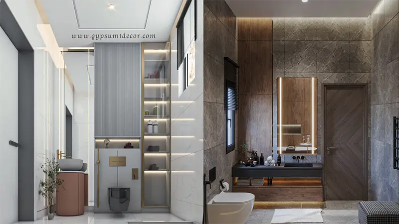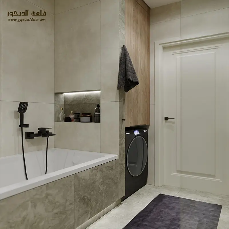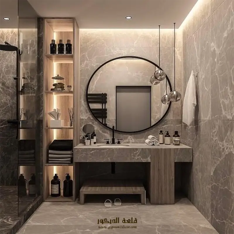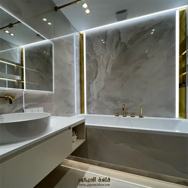 يوجد العديد من ديكور حوائط الحمامات العصرية تعتمد على بلاط البورسلان بتصميم عصري جذاب يعطي هوية لديكور الحمام البسيط، مع وضع رفوف خشبية في الجدران بتصميم مودرن لحمام صغير مع وضع بانيو للحمامات الصغيرة بأفكار ملهمة لا تحتوي على مساحة كبيرة لحمامك.