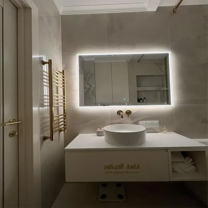 رابعاً يمكن للمرآة الكبيرة أيضا أن تعكس الضوء وتخلق وهم مساحة أكبر جانب آخر مهم هو حلول التخزين الذكية، مثل تصميم الأرفف والأدراج حيثما أمكن ذلك للاستفادة الكاملة من المساحة المتاحة بالإضافة إلى ذلك، يمكن أن يساعد اختيار الألوان الفاتحة للجدران.